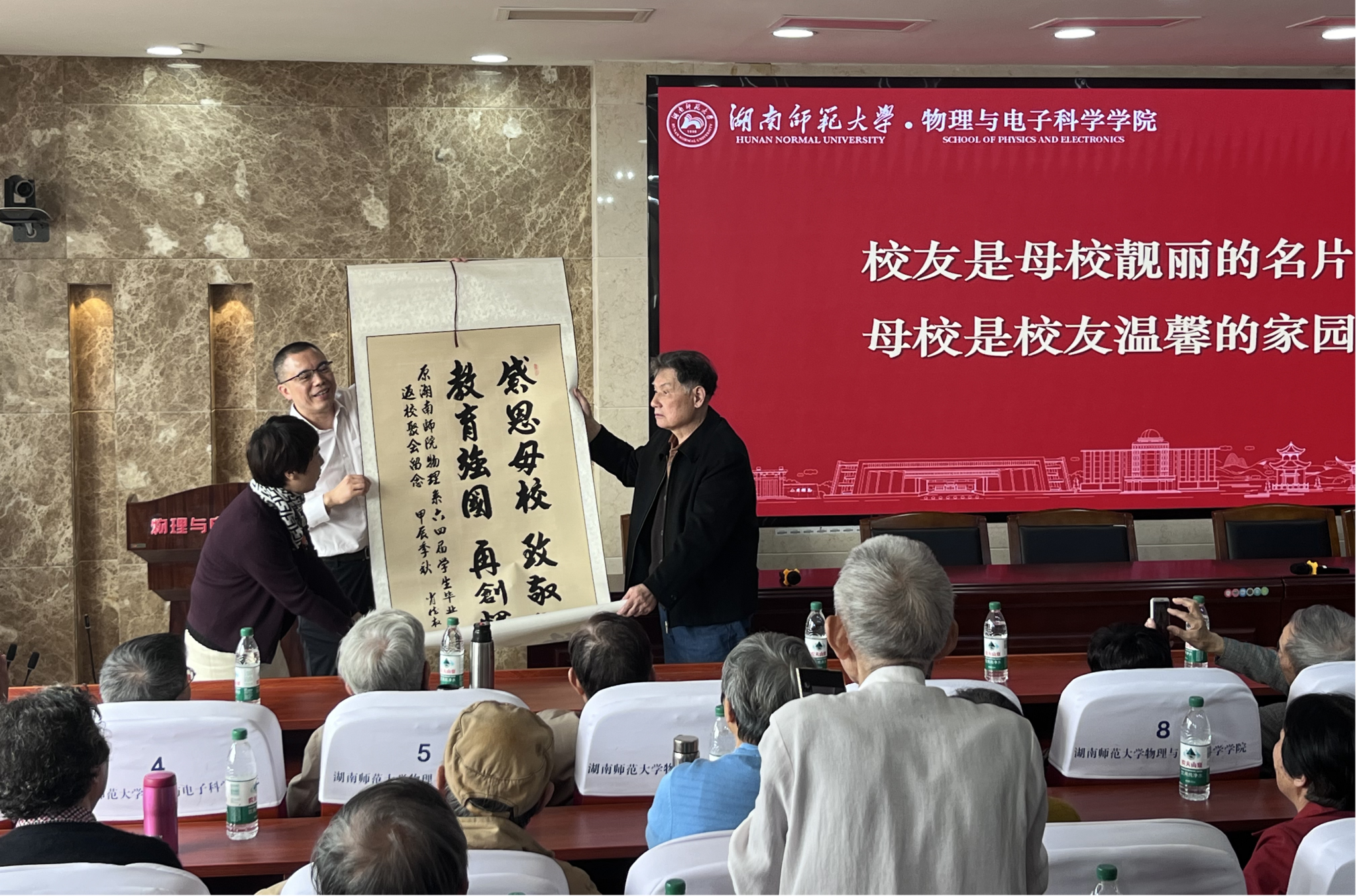 活动最后,校友代表向学院赠送了精心准备的字幅,“感恩母校,致敬师长;教育强国,再创辉煌”,字字都深刻表达出他们对母校培育之恩的无限感激与美好祝愿。