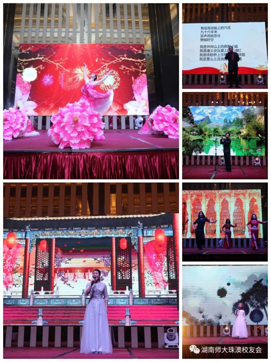 下午五点二十,2019年湖南师大珠澳校友会年会正式开启。校友会“艺术团”再度为大家带来一场堪称专业的晚会。开场舞《花开富贵》大气磅礴;周超师姐献唱一首《梨花颂》,婉约动人;曾继文师兄朗诵自己创作的《穿越时空》,声情并茂;笛子独奏、二胡齐奏、肚皮舞、傣族舞……节目形式丰富多彩;更有师二代勇敢登台,用歌声、读书声传承师大精神。