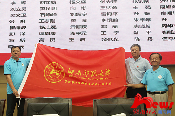 周俊武为校友会授会旗,并为首届会长、执行会长颁发聘书。杨玲、校友总会副秘书长彭正乔、谢炳庚、学院党委书记彭才华为理事会其他成员颁发聘书。