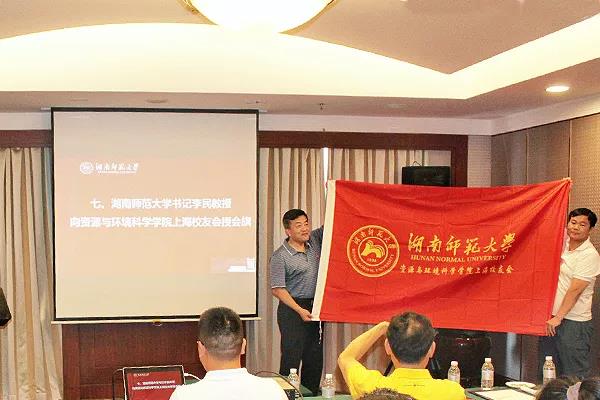 李民为校友会授会旗,并和与会嘉宾一起向首届理事会成员颁发聘书。