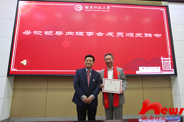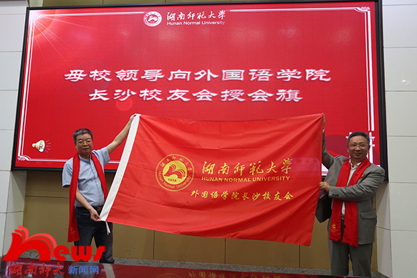 蒋洪新、周俊武、杨玲与外国语学院长曾艳钰、院党委书记余英共同为大家颁发聘书。周俊武为外国语学院长沙校友会授会旗。