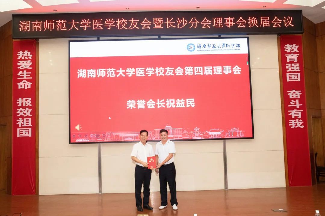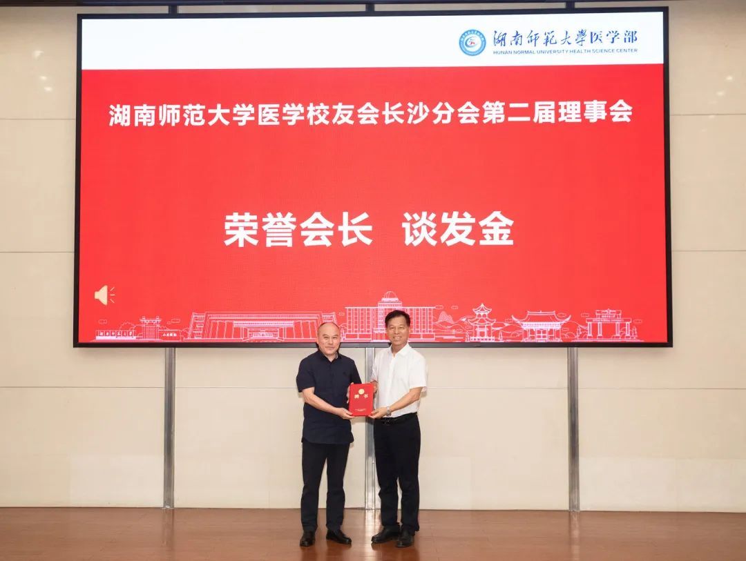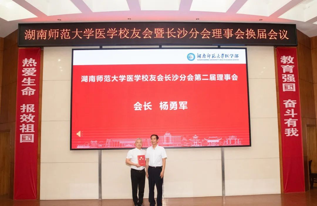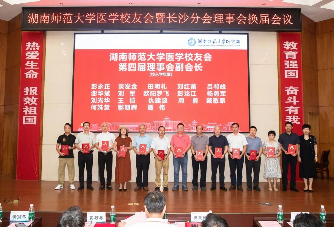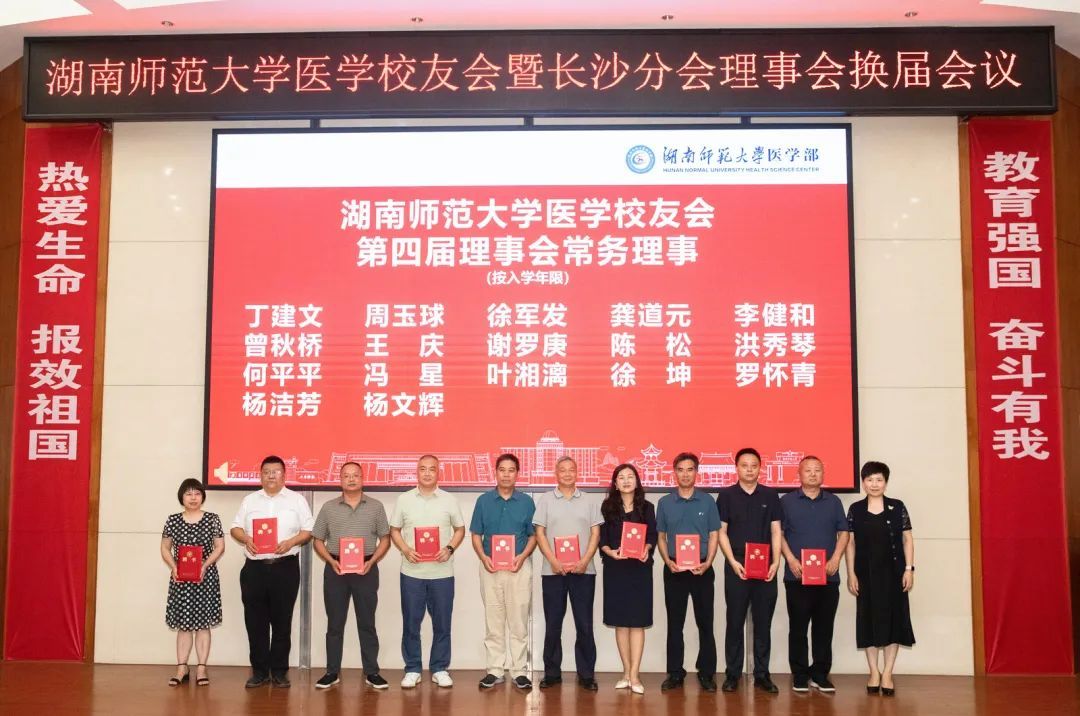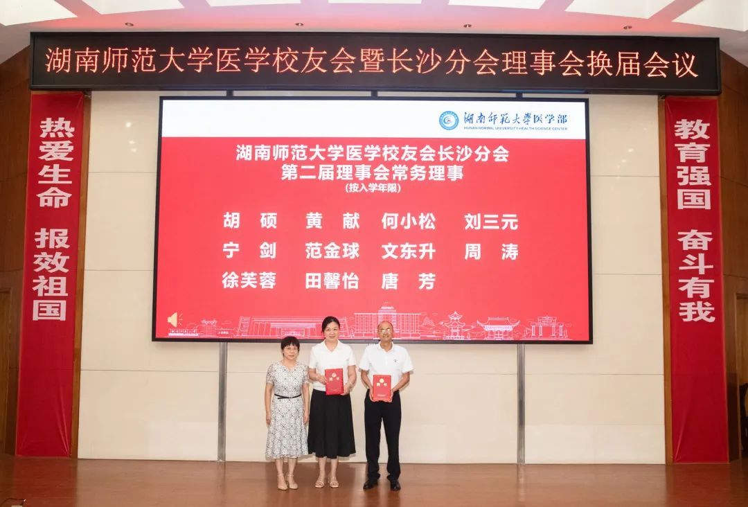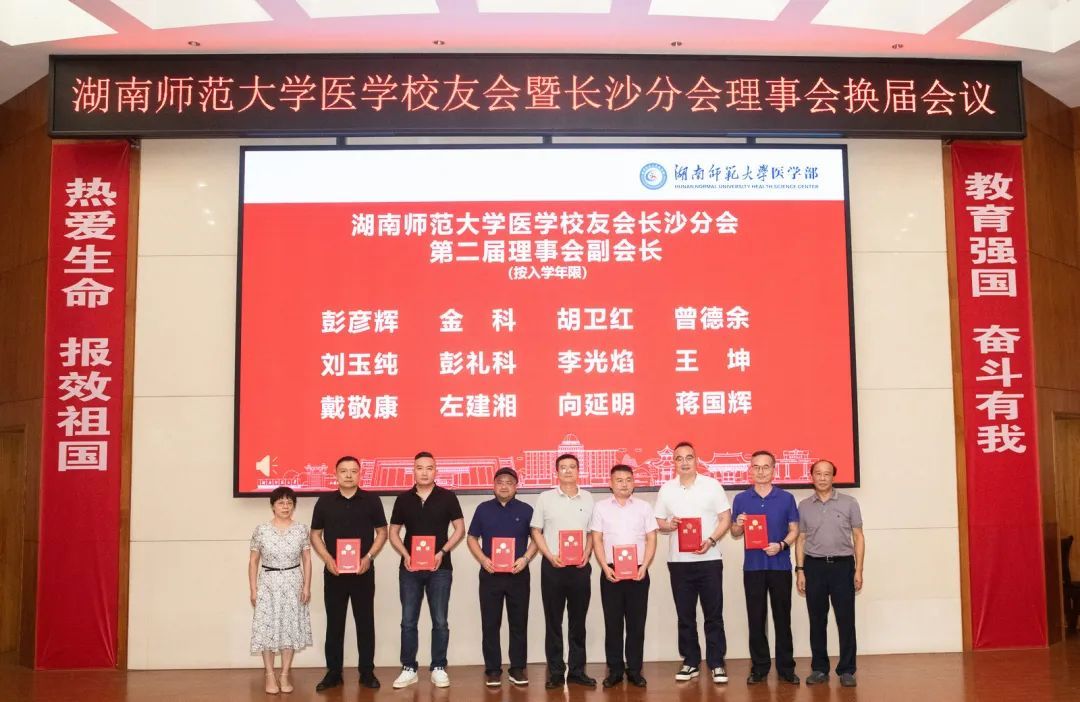 王辉、黄丽萍、校友总会副秘书长贺慧星为我校医学校友会理事会成员颁发聘书;祝益民、瞿树林、鄢朝晖、谭伟、医学部党工委办公室主任杨洁芳、医学部学生工作办公室主任郭铭伟为我校医学校友会长沙分会理事会成员颁发聘书。