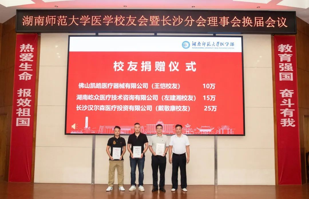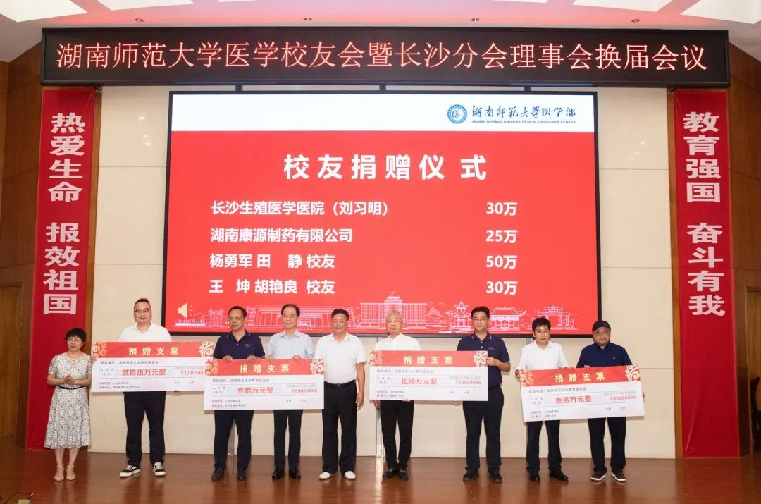王辉为长沙生殖医学医院院长刘习明、湖南康源制药有限公司、杨勇军-田静伉俪兼校友、王坤-胡艳良伉俪兼校友、佛山凯皓医疗器械有限公司王恺校友、湖南屹众医疗技术咨询有限公司左建湘校友、长沙汉尔森医疗投资有限公司戴敬康校友等颁发捐赠证书。