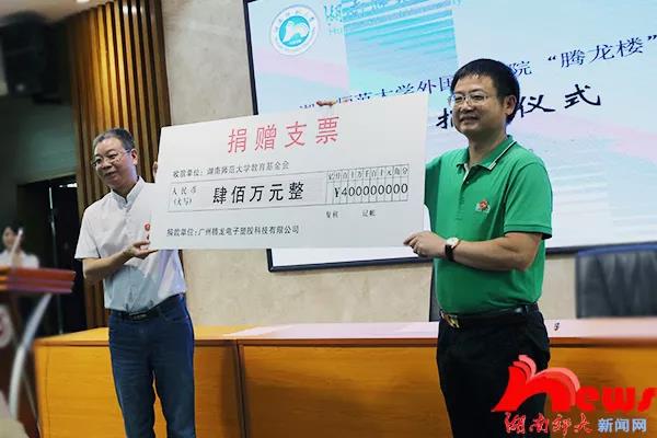 据悉,彭学文和刘学文早在2009年就发起倡议并在外国语学院设立“腾龙奖学金”,已累计捐赠150余万元,300余名学子得到奖励和资助。此次,值学校80华诞之际,彭学文和刘学文再次捐赠400万元设立外国语学院“腾龙楼”建设基金。捐赠分为两次,今年和明年10月1日前各捐200万元。外国语学院师生高度评价两位校友的捐赠行为,认为他们的捐赠是校友回馈母校的典型、是回报社会的义举,更是对教育事业的贡献。