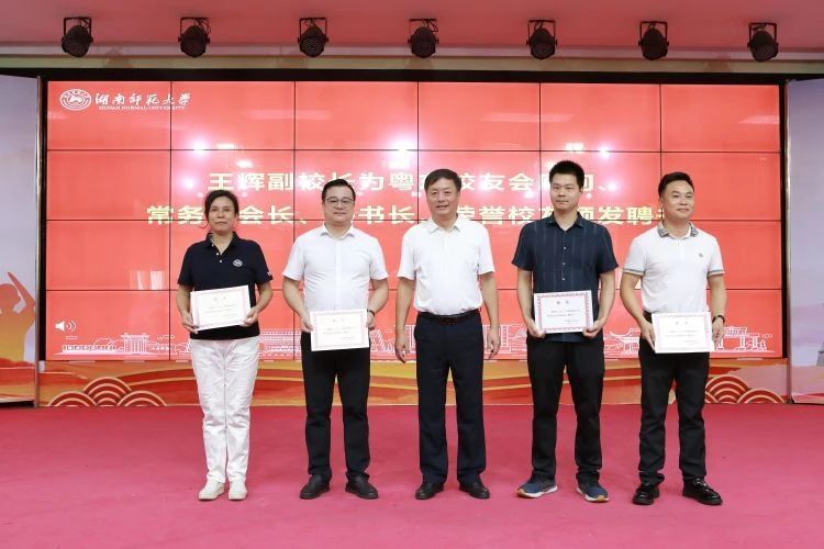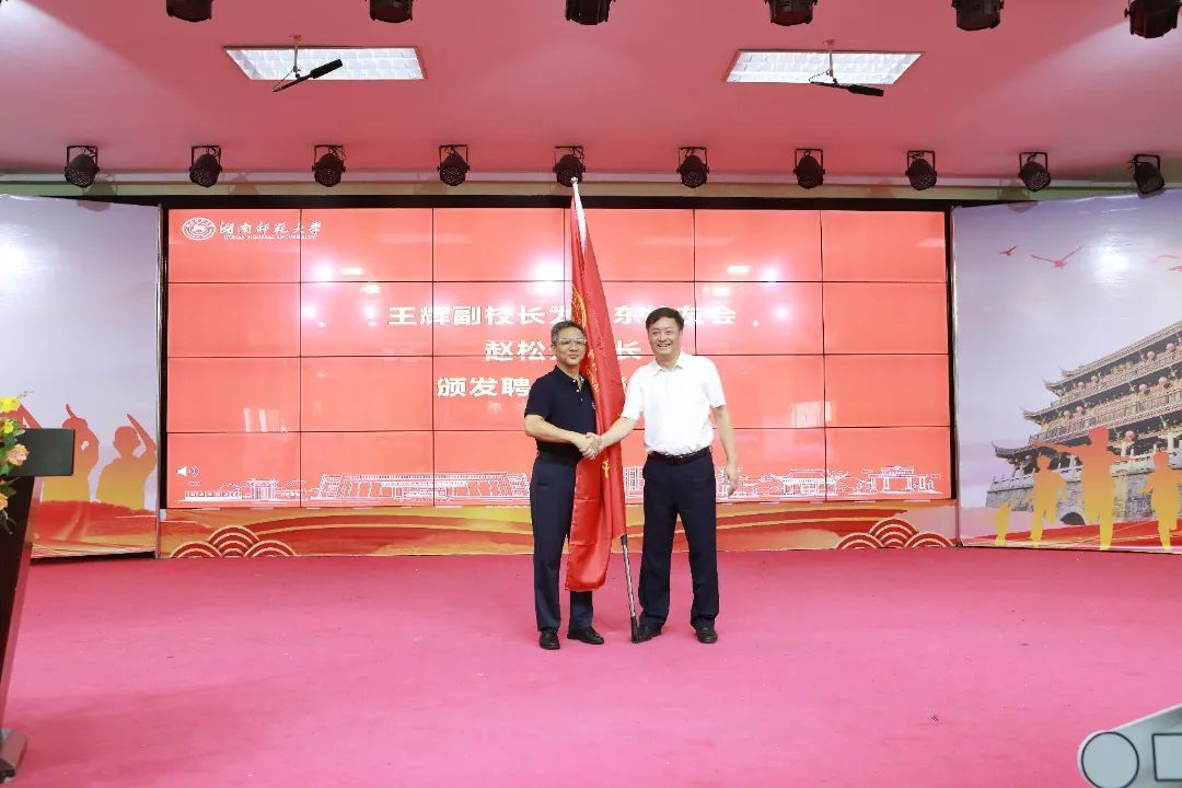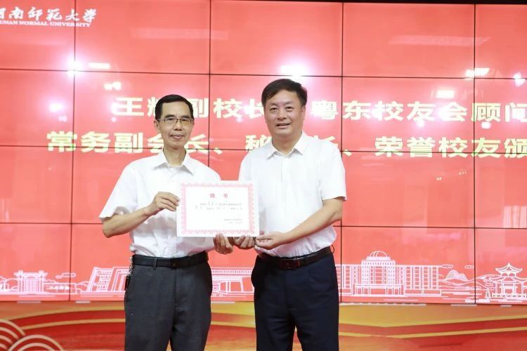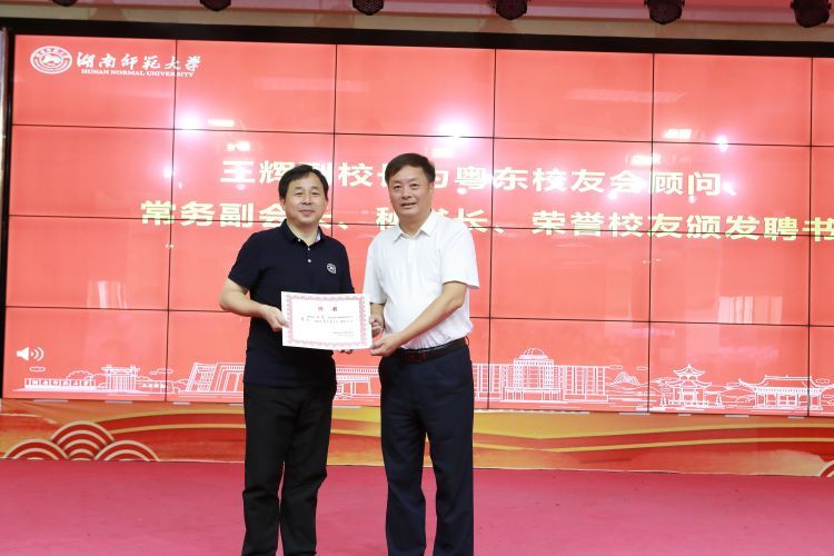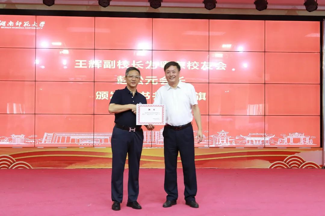王辉向粤东校友会首任会长赵松元授会旗、颁发聘书,并为粤东校友会顾问、常务副会长、荣誉校友颁发聘书。