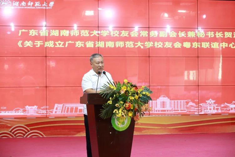 粤东校友会会长赵松元致辞。他对帮助粤东校友会成立的各分会校友、对筹备组的校友表示真挚的感谢。他表示,粤东校友会拉开了校友活动的序幕,让粤东四市的校友们有了一个共同的家。他特作一首《南歌子·湖南师大粤东校友会成立感怀》词,抒发自己对母校、各校友会及校友们深沉绵厚的情思。赵松元表示,将以校友会的成立为契机,不断加强校友之间、校友与母校之间的联系,增进了解和友谊,促进共同发展。