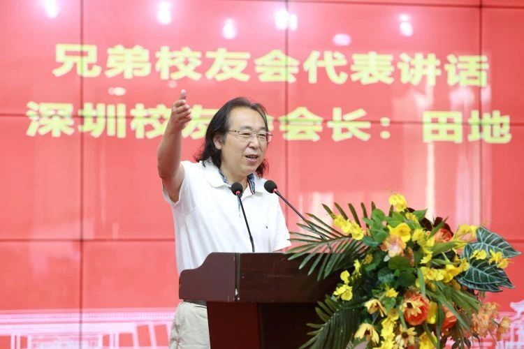 深圳校友会会长田地代表兄弟校友会致辞。首先,他对粤东校友会的成立表示祝贺,粤东校友会的成立建立了校友与校友、校友同母校更好的平台,他表示,以后将加强校友会之间的联系、交流与合作,增进校友间感情,以校友会之力助母校更好的发展。