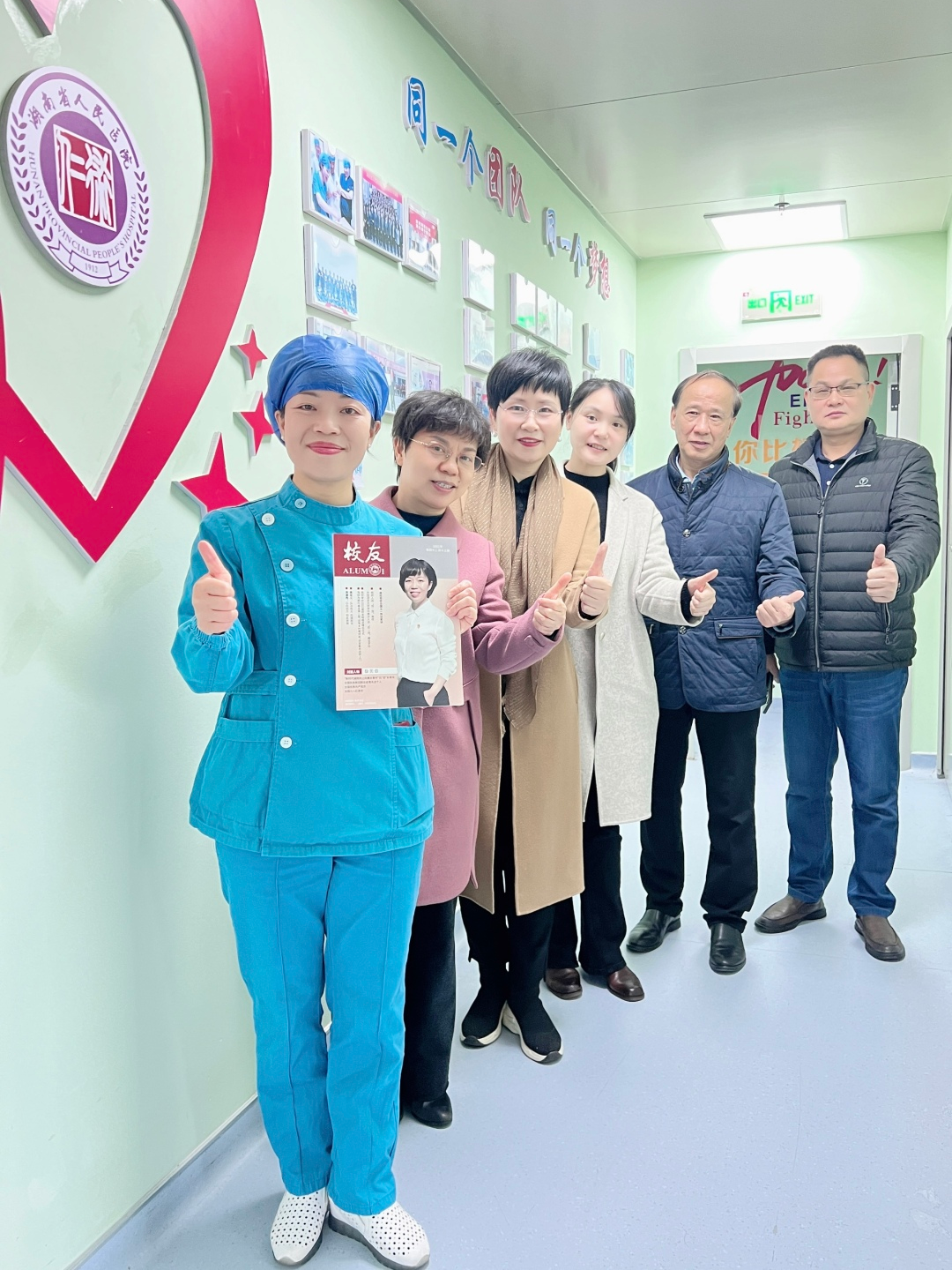 近日,我校校友总会·教育基金会和医学院共同走访看望我校医学院03级校友、中共二十大代表、湖南省人民医院急诊重症监护室护士长徐芙蓉并进行座谈。校友总会·教育基金会秘书长黄丽萍、医学院党委书记鄢朝晖、美术学院原党委书记谭伟、校友总会副秘书长余志华一行参加座谈。