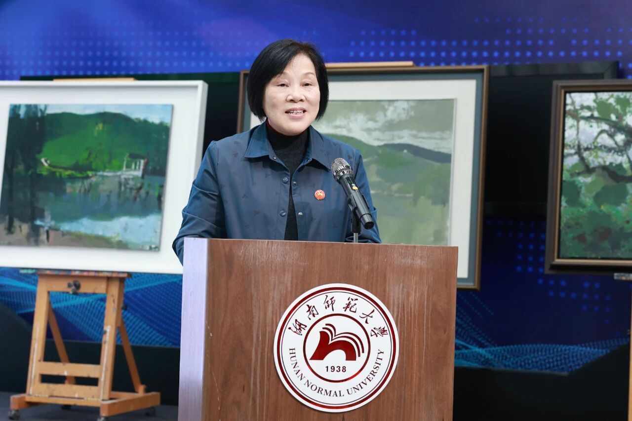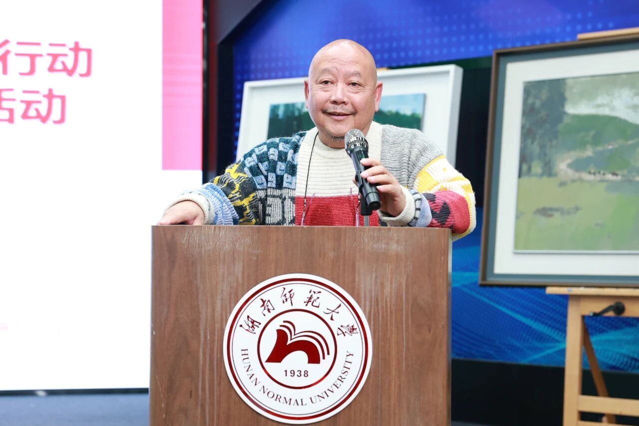 我校美术学院教授、省油画学会主席党朝阳介绍此次爱心捐赠及义卖情况。截至目前,关爱基金已募集艺术家油画9幅,获得校内外捐赠善款42万余元。该项目将用于帮扶困难学生,助力其成长成才。他指出,爱是艺术的底色、艺术是爱的表达,湖湘油画百年发展始终与时代同频,艺术家以作品为媒传递爱心,是文艺工作者服务社会的生动实践。