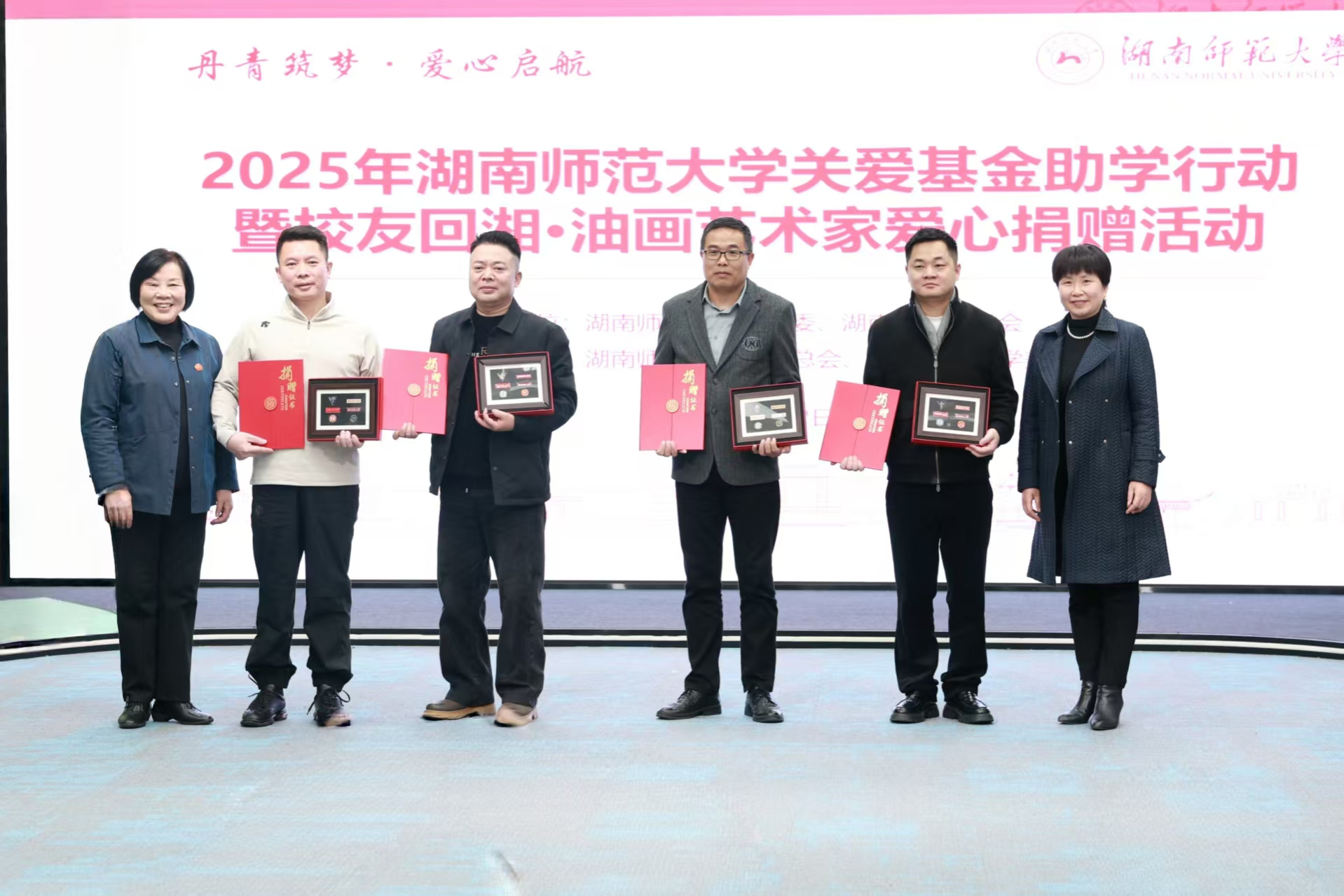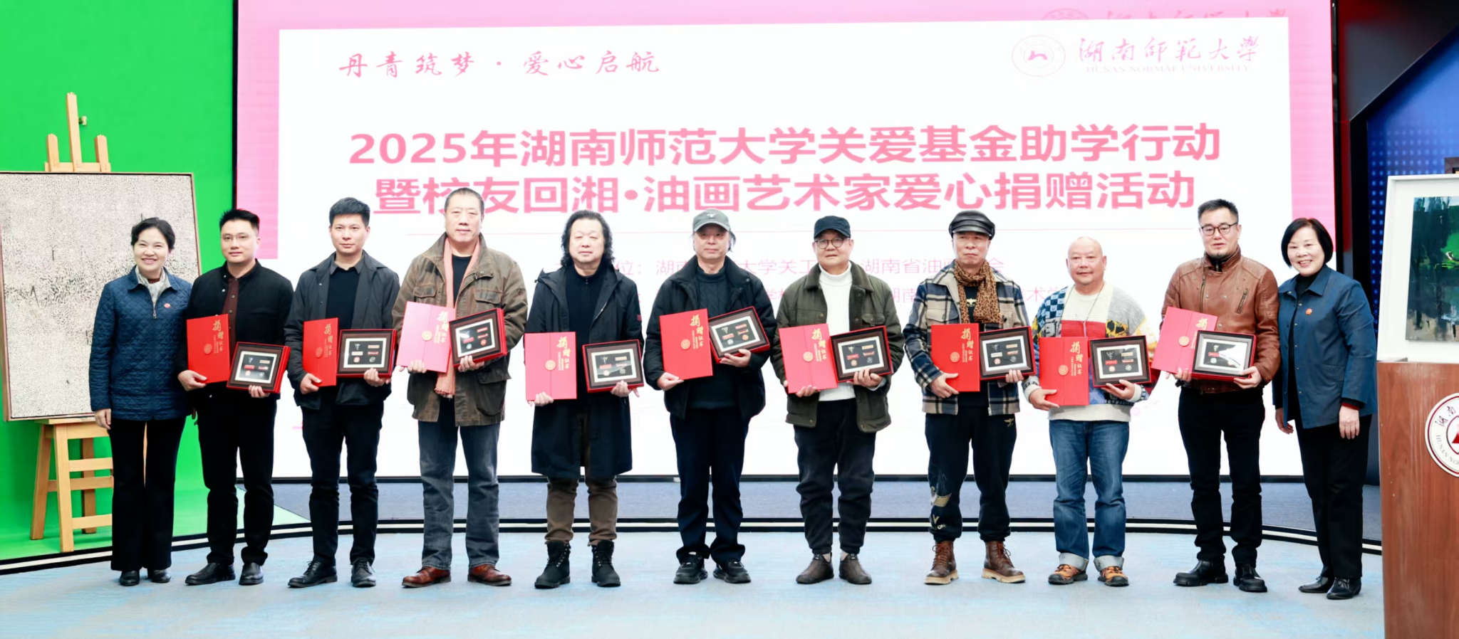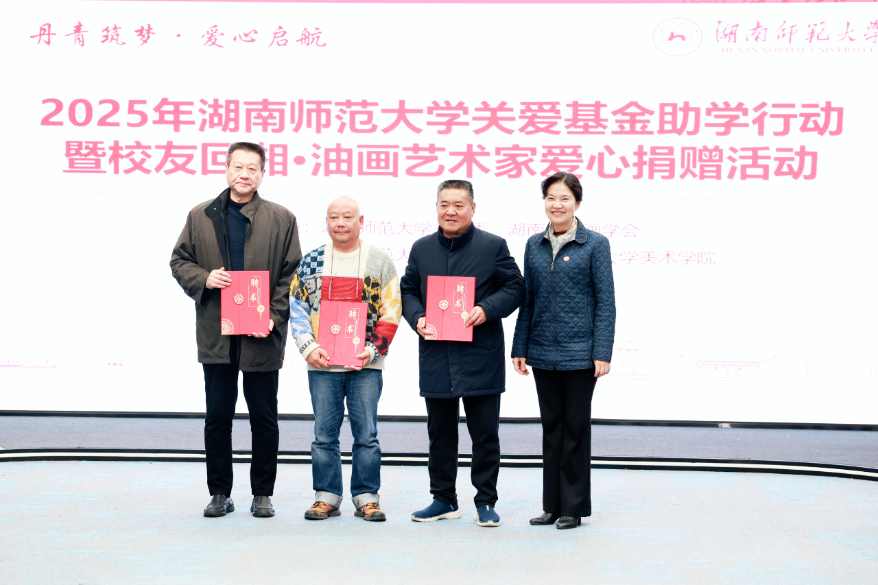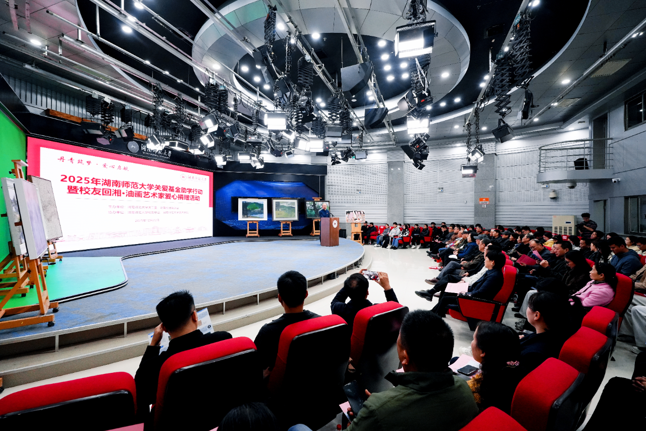 12月22日下午,由校关工委、湖南省油画学会主办,校友总会·教育基金会、美术学院协办的“丹青筑梦 爱心启航”2025年太阳成集团tyc关爱基金助学行动暨校友回湘•油画艺术家爱心捐赠活动在我校融媒体中心展播厅举行,校党委副书记、关工委主任段巍,关工委常务副主任徐书华,校友总会·教育基金会秘书长黄丽萍等相关单位负责人出席活动。离退休处负责人尹建新主持活动。