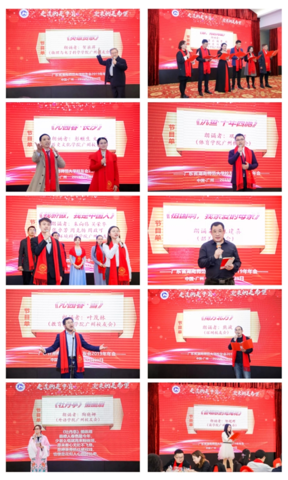 东西南北春常在,总有情怀留心间。为感恩母校和迎接新春,此次年会还举办了第一届朗诵比赛,参赛选手们或诵读经典诗文,或朗读个人原创篇目,或分享关于大学、事业、读书和个人情感的感悟,或表达真挚的家国情怀。深圳校友会熊波校友的《南方北方》让大家体会到了南下游子的壮志豪情;叶茂林校友朗诵的《沁园春·雪》和彭顺生、文香合诵的《沁园春·长沙》让大家深深领略到毛泽东经典诗词中的伟人气质,资环学院集体朗诵的《我骄傲,我是中国人》激发起在座的校友强烈的爱国情和自豪感。