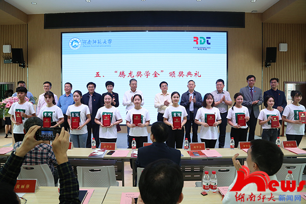 学生工作部(处)部长向发意宣读“腾龙奖学金”获奖名单,腾龙集团领导和校领导共同为获奖同学颁发奖学金。