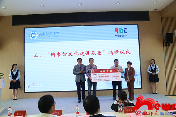 黎大志代表学校接受腾龙集团对我校的捐赠。图书馆馆长夏赞才对腾龙集团设立“图书馆文化建设基金”表示衷心感谢。他简要介绍了我校图书馆的基本情况,并希望,图书馆能够在校友的支持下越办越好,成为师大的靓丽文化名片,为学科发展、学校“双一流”建设做出贡献。
