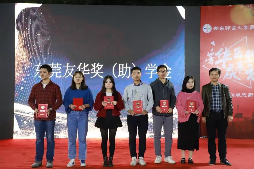 随后,医学院院长何祖平宣读表彰决定。刘令安校友代表汉森集团财务总监宋杰群、汉森集团行政主管张璇琦、谈发金校友代表湖南康寿制药有限公司总经理助理王志峰、杨勇军校友代表省儿童医院副主任药师田静、院长何祖平、刘习明校友代表长沙宁儿妇产医院执行院长郭红、校友长沙市隆康医疗器械有限公司总经理向延明依次上台为获奖学生与集体颁奖,给获奖学子送上亲切的关怀和美好的祝愿,并合影留念。