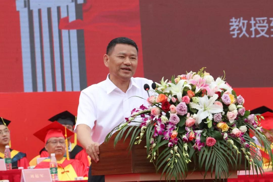 我校化学化工学院1982届毕业生、中国科学院院士、湖南大学副校长、博士生导师谭蔚泓教授致辞。他回顾了在师大求学的美好岁月,分享了自己的人生心得,表达了对母校及毕业生的衷心祝福。他鼓励毕业生们肯定自我,不断突破,怀揣“天生我材必有用”的信念,紧跟时代,让青春与祖国共奋进。