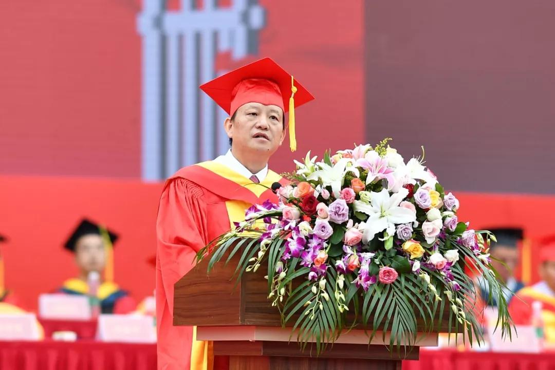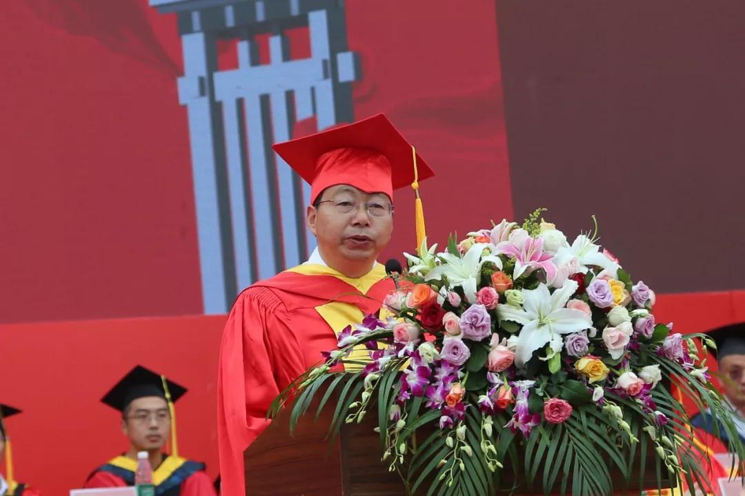 校长蒋洪新教授向全体毕业生同学致以热烈的祝贺和诚挚的祝福。他动情地说,大家把最美好的青春时光交付给了师大,师大也见证了大家的成长。今天大家毕业了,成了师大最年轻的校友,为大家感到自豪!他借用《大学》开篇“大学之道,在明明德,在亲民,在止于至善”与大家话别,勉励大家深思笃行、止于至善。他表示,深思笃行方能跟上时代,大家要跟上新时代步伐,不断拓展视野格局,调整思维坐标,深思笃行,从新的历史方位和现实国情来把握新时代,确认判断和选择。深思笃行方能走向卓越,新时代呼唤新担当,新青年要堪当时代大任,大家要深思笃行,将一个个小创意付诸实践,并以杰出校友为榜样,立足实干苦干,在担当中历练,在履职中成长,在新时代绽光彩。深思笃行方能感受幸福,幸福作为最高善,贯穿人的一生,追求幸福需要在不同的转念与心境间找寻平衡,希望大家都能多一份舒畅,少一份焦虑;多一份真实,少一份虚妄;多一份欢悦,少一份悲苦,让简静从容的生活带给内心世界的无限充盈。最后,他祝愿大家无论何时何地,无论逆境顺境,都能够坚持独立思考,倾听内心的呼唤,在深思笃行中收获美满幸福的人生。