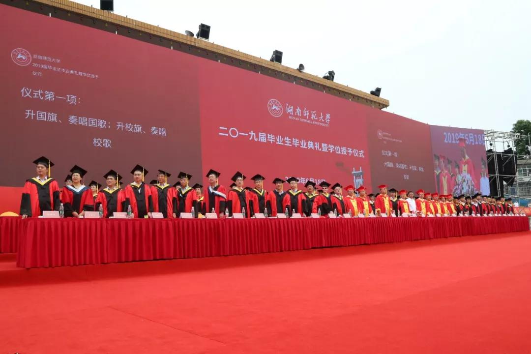 仪式之前,学校举行了“青春,为祖国歌唱”2019届毕业典礼文艺演出,音乐学院师生代表带来的《校歌》《我爱你,中国》《长大后我就成了你》等歌曲吟唱出湖南师大人对师道初心的执着坚守,对仁爱精勤的永恒追求,展现着一代又一代师大人践行以教育报国为己任、以民族大业为担当的良好精神风貌。著名歌唱家、音乐学院民族声乐系主任、博士生导师王宏伟教授的独唱《我和我的祖国》,更是将现场氛围推向高潮,7000余名师生高声合唱《歌唱祖国》,向祖国70华诞献礼,用歌声向祖国宣誓:拥抱新时代、奋进新时代,让青春在为祖国、为人民、为民族、为人类的奉献中焕发出更加绚丽的光彩!