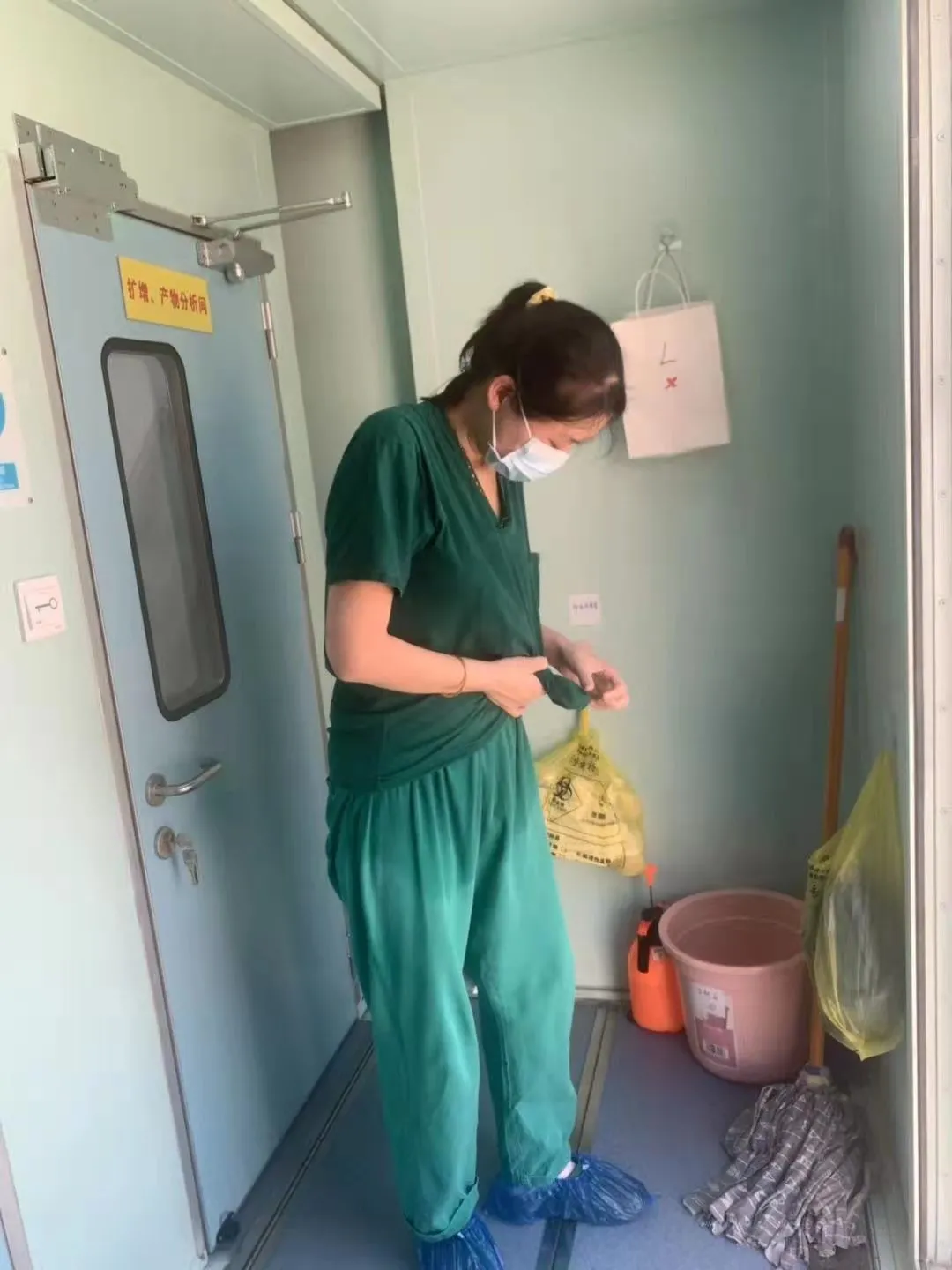 正值盛夏,核酸车外烈日当空,车内像铁皮蒸笼一样,经常汗流浃背。日常工作就是采集每一个居民的核酸样本,再进行化验测试。曾一天半完成了约20000人次的测试。即便是任务紧急,工作量大,昼夜颠倒,白晚班轮替。她也只是一句“我还是受的住的。”
