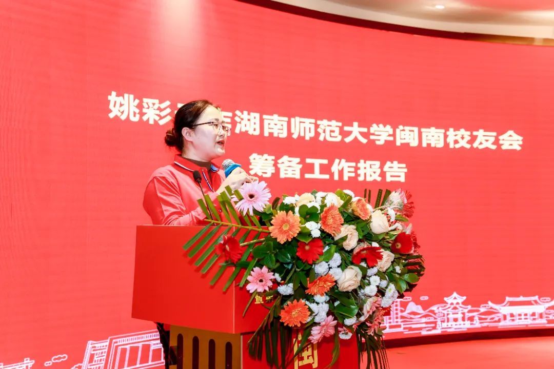 筹备组副组长姚彩云代表闽南校友会筹备工作组作工作报告,她介绍了校友会筹备情况和闽南校友概况,并表达了对学校、对校友们的美好祝愿。