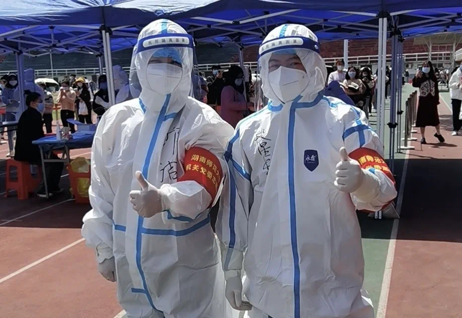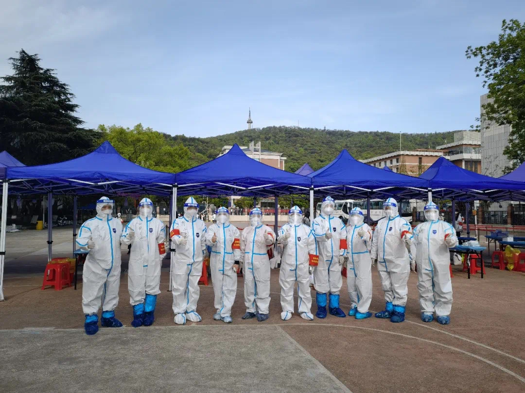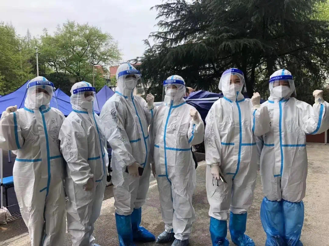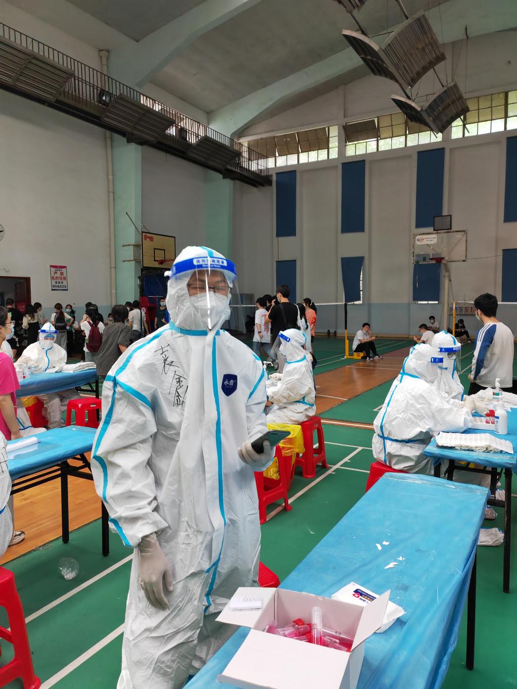 穿上防护服,油然而生的神圣感让志愿者们迅速克服了密不透风的不适,有条不紊地完成工作。长期的封锁和重复的检测不免让部分师生产生焦虑烦闷的情绪,利用录入信息的时间,志愿者们也总用关心、问候给他们带去一丝轻松。