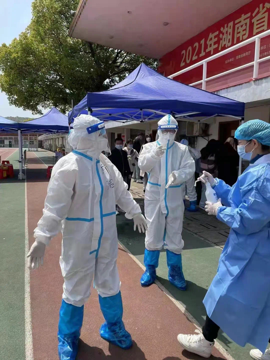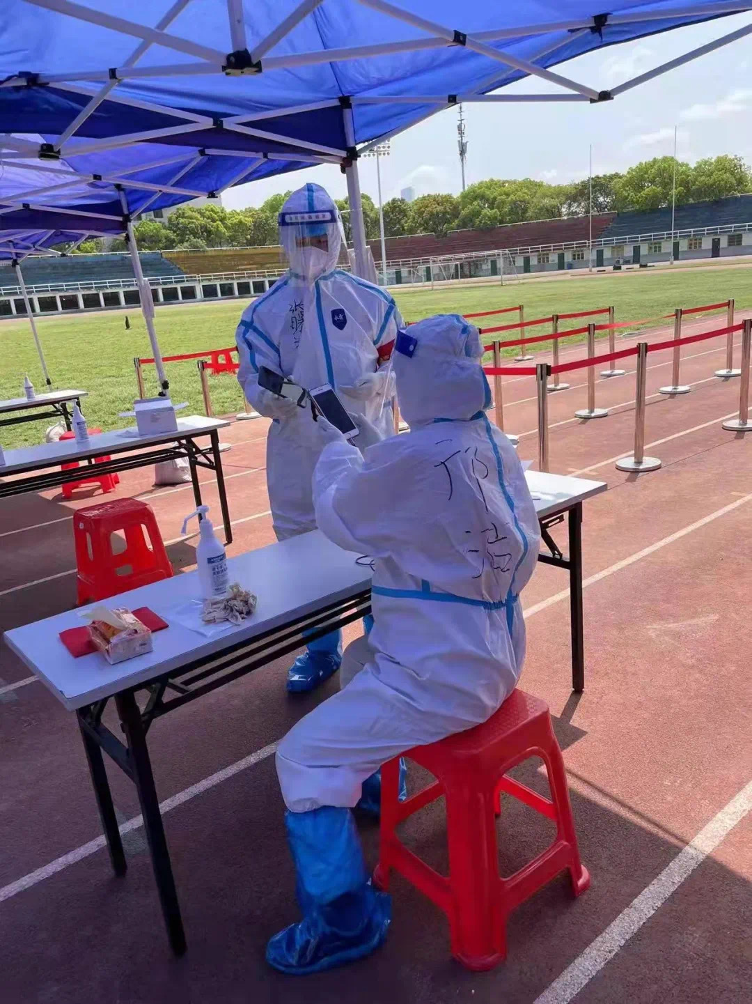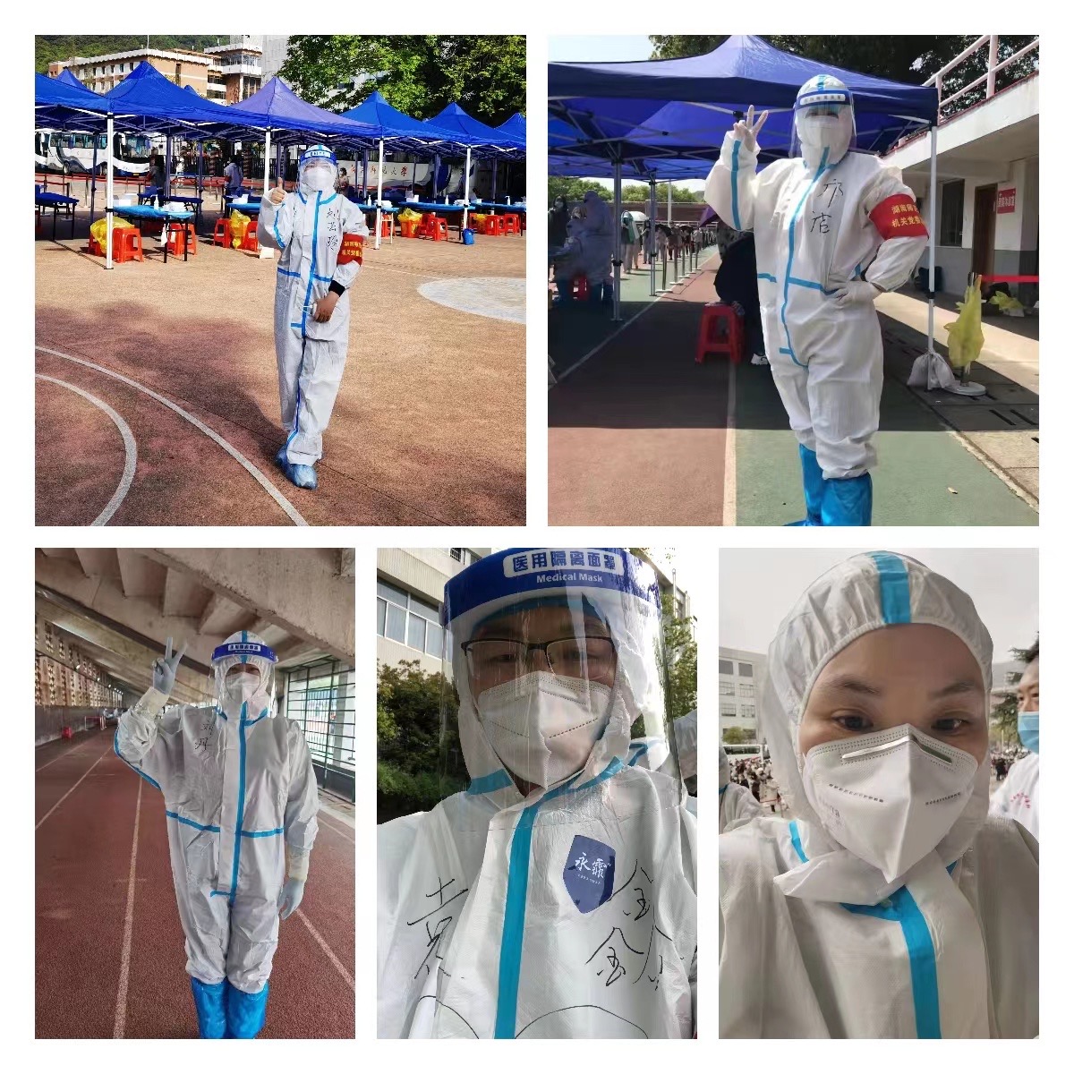 穿上防护服,油然而生的神圣感让志愿者们迅速克服了密不透风的不适,有条不紊地完成工作。长期的封锁和重复的检测不免让部分师生产生焦虑烦闷的情绪,利用录入信息的时间,志愿者们也总用关心、问候给他们带去一丝轻松。