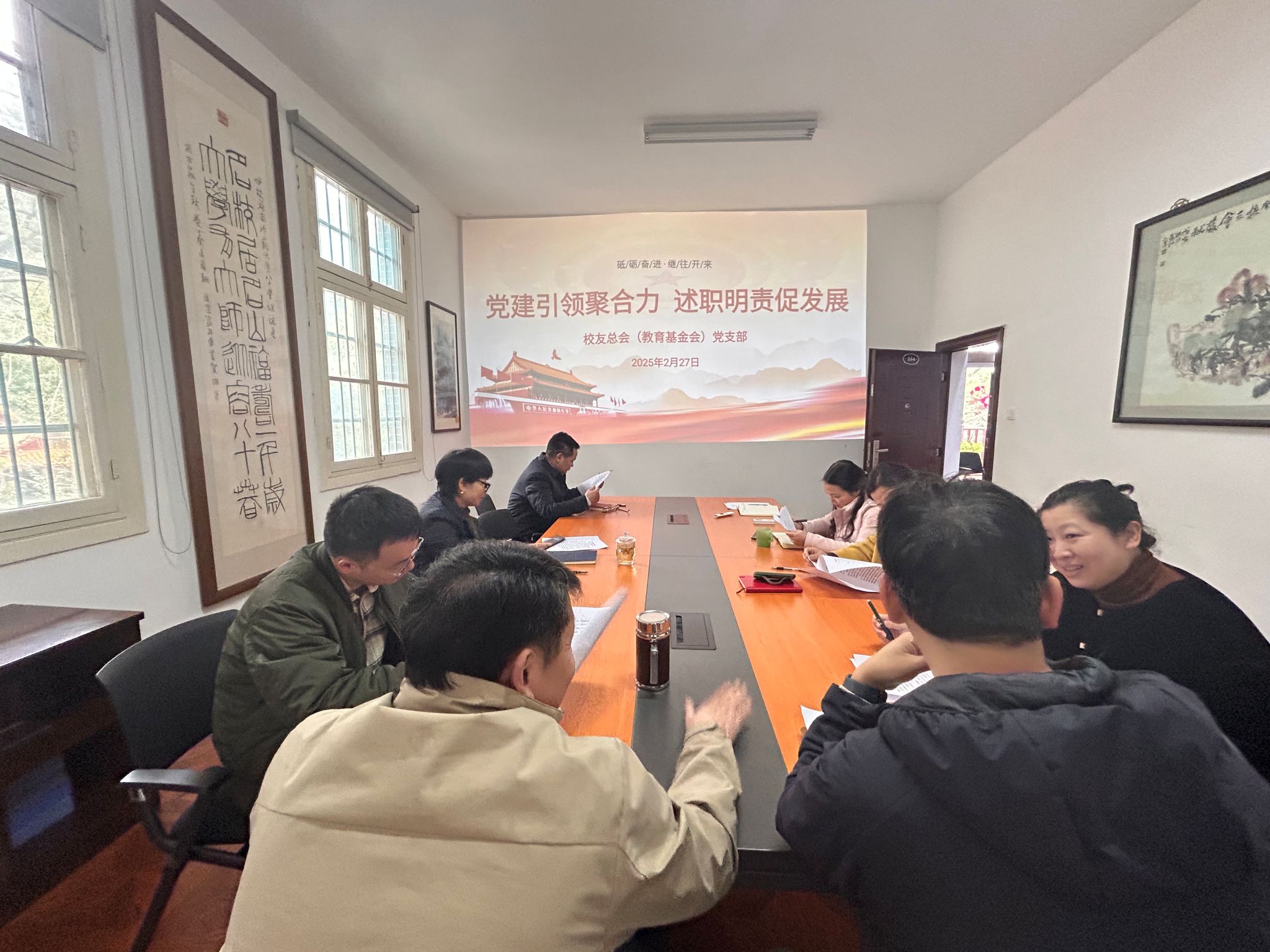2月27日下午,校友总会(教育基金会)党支部在校友总会二楼会议室举行“党建引领聚合力 述职明责促发展”为主题的主题党日活动。全体党员干部参加,活动由支部书记黄丽萍主持。