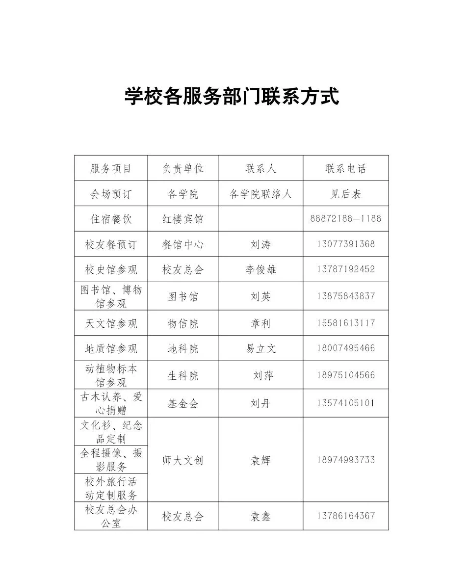 校友总会秘书处、各学院及相关职能部门将全力为校友返校联系、落实好各项服务项目。