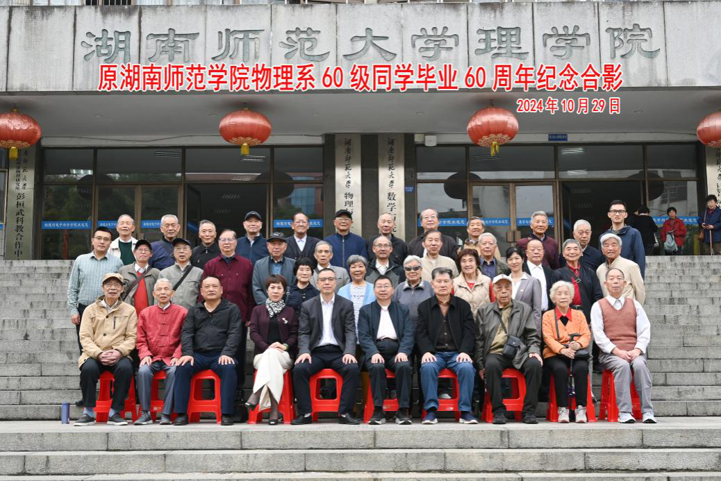 (供稿:物电院学工办)10月29日,湖南师范学院物理系60级校友回母校举行毕业六十周年欢聚活动。太阳成集团tyc原副校长匡乐满、校友总会副秘书长贺慧星、物理与电子科学学院院长刘红荣、院党委书记罗嵘、院党委副书记郭铭伟、副院长李友明、专职组织员吴浪波等出席聚会。活动由60级校友刘务本主持。