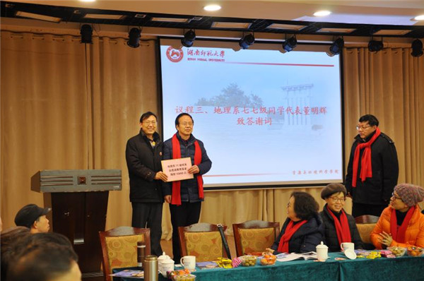 校友董明辉代表地理系七七级校友表达了对母校和老师的崇高敬意,衷心的祝愿母校明天越来越辉煌,并代表地理系七七级校友向资环院“思源教育基金”捐款10000元,用于支持学院的发展或资助家庭经济困难学生,并为学院捐立题字为“天地人和”的石碑,留下他们永久的记忆和光辉的历史,为资环学院学弟学妹们树立了一个良好的形象。