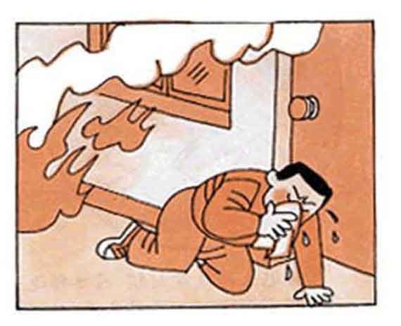 如果身处之地被困在着火范围内,但火势还未燃烧至此,只是烟雾在周围弥漫,此时应当尽量放低身体,最好是匍匐前进,最好能用湿毛巾或织物等捂住口鼻。因为很多时候周围火势会产生大量有害气体,人体大量吸入这些有害气体后往往是致命的。