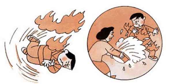 如果身上着火火势已比较大,且来不及撕破衣服或脱掉衣服,在周围也没有较近的水源或者灭火设备的情况下,可以就地打滚,试着把火压灭。若是旁边有人,可求助其帮忙用扫帚、衣服、棉被等物拍打、闷盖,不到万不得已,最好不要用灭火器之类的器械直接向人体喷射。以免其所含化学物质对本已处于被火灼烧后低抵抗力的人体造成不必要的损害。